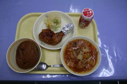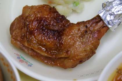 今日は「クリスマス献立」です。骨付きの鶏肉に下味をつけじっくりとオーブンで焼き「ローストチキン」をつくりました。