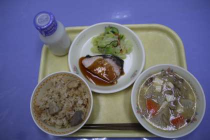 牛乳 里芋ごはん ぶりの塩麹焼き 浅漬け きのこ汁
