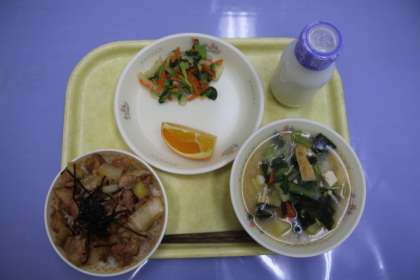 牛乳 焼きとり丼 ごまあえ じゃがいものみそ汁 ネーブルオレンジ