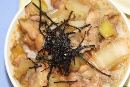 鶏肉を下味につけてオーブンで焼き、長ねぎとたれを合わせて焼きとり丼を作ります。