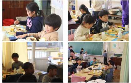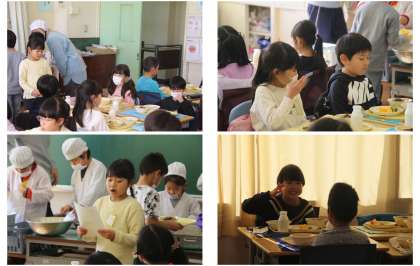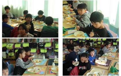 今日のメニューは「やきとりどん」です。「とりもやわらかくでおいしい。今までで食べたねぎでいちばんおいしい」なとど感想を言っていました。職場体験の中学生も、「おいしいです」と言ってくれました。