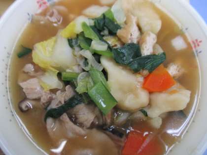 町田産の野菜を使用し、中力粉を使い、よくこねてうすく伸ばしてちぎってすいとんを作ります。