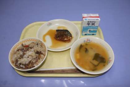 牛乳 五目ごはん サバの香味てりやき 味噌汁