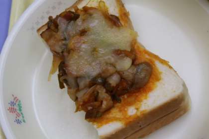 ピザソースを作り、野菜とベーコンを炒めてパンに塗り、チーズをのせて焼きます。