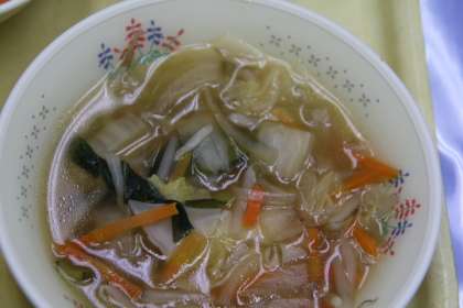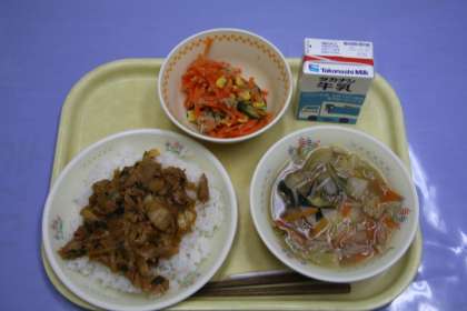 牛乳 キムチ丼 人参サラダ ワンタンスープ