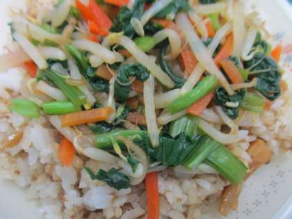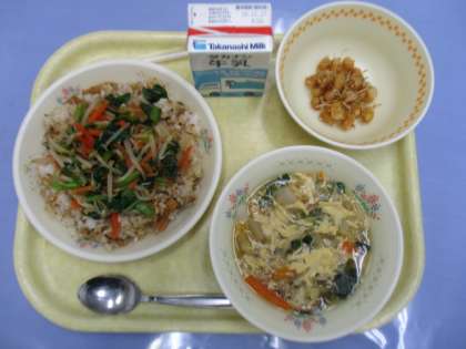 牛乳 ビビンバ・大豆とじゃこの甘辛揚げ 卵と野菜のスープ