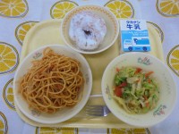 スパゲッティナポリタン オニオンドレッシングサラダ さつまいもドーナツ 牛乳今日...