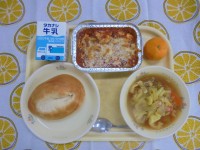 ソフトフランスパン 豆腐のミートグラタン ひよこ豆のカレースープ 果物(みかん)...