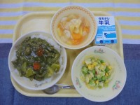 キムタクごはん 厚揚げ入りごまサラダ 中華スープ 牛乳今日は、キムチとたくあんを...