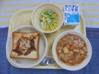 ピザトースト 米粉のチキンビーンズ フレンチサラダ 牛乳今日は、給食室で具を1か...