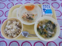 麦入りごはん 菜の花蒸し 中華和え すまし汁 牛乳今日は、肉団子にとうもろこしを...