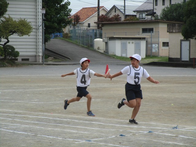 運動会リレー練習が行われています。4・5・6年生の代表選手が一つのチームになってバトンをつないでいきます。