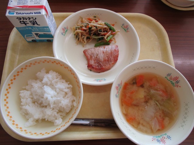 17(金)ご飯、コンディションたかまるみそしる、豚肉の生姜焼き、パワーアップナムル、牛乳