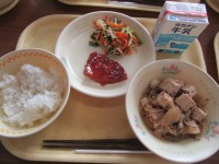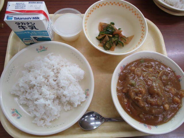 29日(水)ひよこ豆とチキンのカレーライス、手作り福神漬け、カルピスゼリー、牛乳