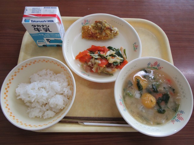 28日(火)ご飯、魚のパン粉焼き、洋風野菜炒め、カボチャ団子の味噌汁、牛乳