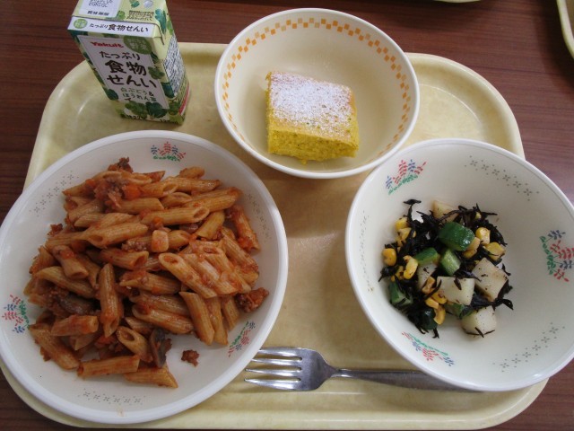 31日(金)ペンネのミートソース、きになる野菜(白ブドウとほうれん草)、ハロウィンケーキ、ひじきとポテトのサラダ、牛乳 ※ハロウィン献立です。