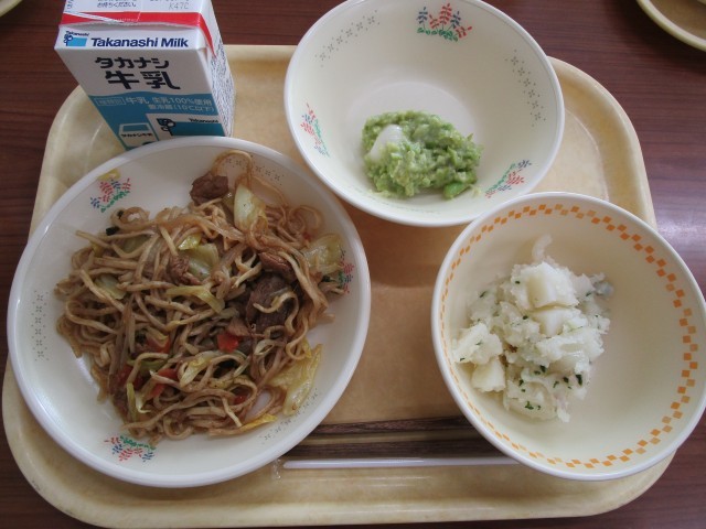 5日(水)カレー焼きそば、ジャーマンポテト、ずんだ白玉、牛乳