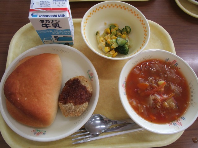 6日(木)ミルクパン、コロッケ、グリーンサラダ、ミネストローネ、牛乳