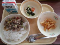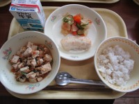 17(月)ご飯、豆腐のチリソース煮、ひじき入りボイル野菜、焼きシシャモ、牛乳