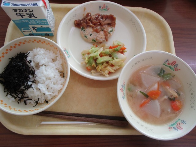18(火)ご飯、ヒジキのふりかけ、つくねの和風あんかけ、ポン酢和え、かぶの味噌汁、牛乳