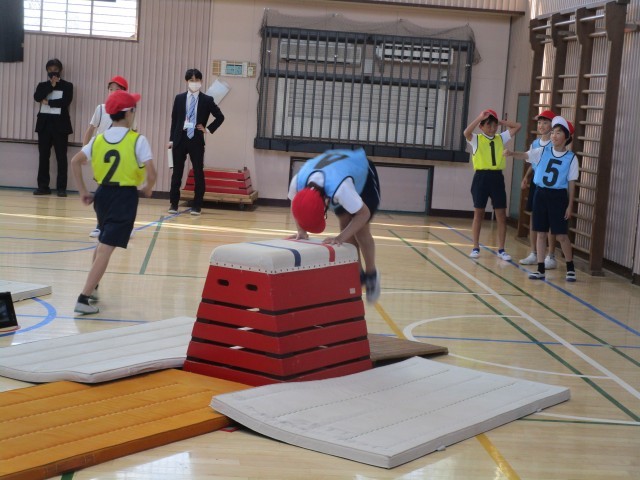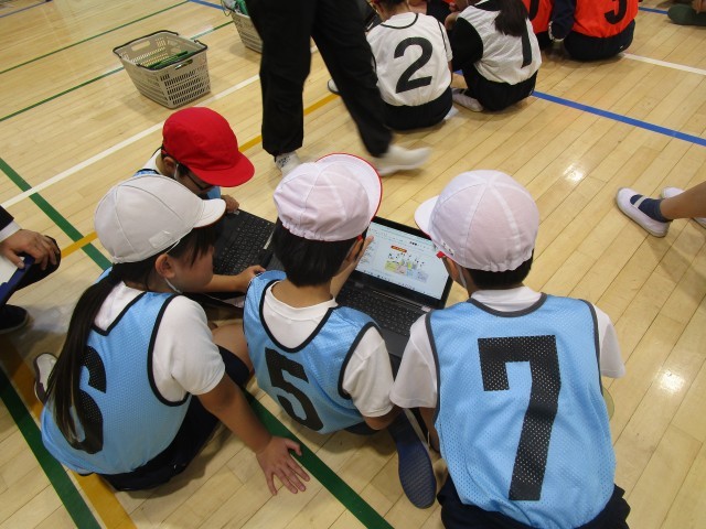 「何段の高さを跳び越す」という高さを競うのではなく「どのように跳び越すか」という跳び方を知ることが大切です。クロームブックで動画を撮影したり、気づきや良かったことなどを打ち込みながら意見を交流していきます。助走・踏切・手のつく位置・腰を高く上げる・前方に前転する・着地などコツを互いに学び合っていました。