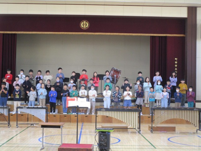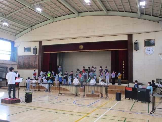 合奏は「聖者の行進」です。鍵盤ハーモニカ・鉄琴・木琴・大太鼓・小太鼓などの楽器で演奏します。指揮者を見ること・リズムを合わせることを何度も練習しました。先生のアドバイスや指示を聞いて、みんな一生懸命に頑張っています。最後にはリズムがそろってきました。
