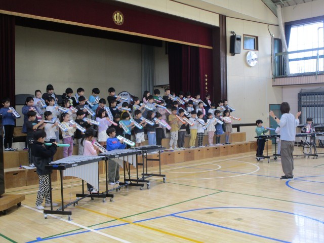 合奏は「こいぬのマーチ」です。最初は全員鍵盤ハーモニカで演奏します。途中からタンブリン・カスタネット・トライアングル・鈴・鉄琴が加わっての演奏です。先生のピアノの音に合わせて途中で楽器が入れ替わります。私語をすることなく、先生のお話が聞ける1年生はとっても立派だなと感じました。