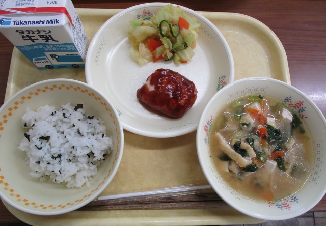 25(火)わかめごはん、野菜たっぷりの味噌汁、デミグラスソースハンバーグ、野菜のレモン醤油、牛乳