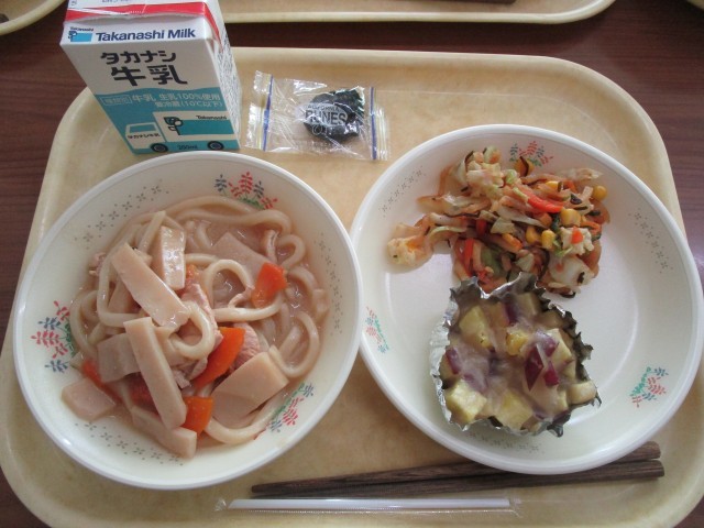 26(水)味噌煮込みうどん、おに饅頭、元気サラダ、プルーン、牛乳