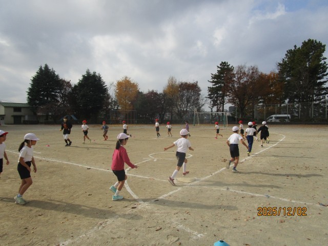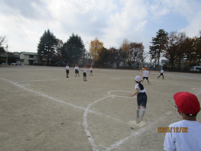 「トン、トン、クルッ」の合言葉で、肘を高く上げて、ボールを上から投げるコツを教えていただき、キャッチボールやミニゲームを通して練習しました。
