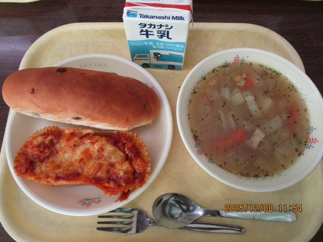 8(月)ぶどうパン、豆腐のミートグラタン、ベーコンと野菜のスープ、牛乳