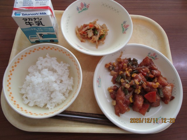 11(木)ご飯、鶏肉とコーンのあげ煮、白菜のおかか和え、牛乳