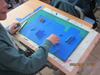「あったらいい町 どんな町」を終えようと、集中して水彩絵の具で彩色したり、仕上げの名札に作品名を書いたりしていました。