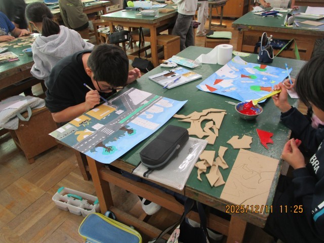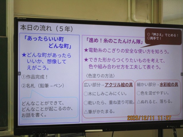12月11日(木)5年生の図工「あったらいい町 どんな町」「進め!糸のこたんけんたい」。