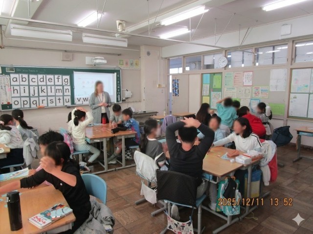 始める前には両手を頭の上において、「f」という声がかかると、元気に反応して手を伸ばしあっていました。