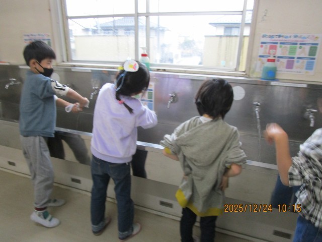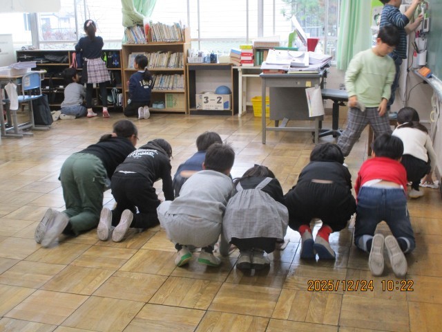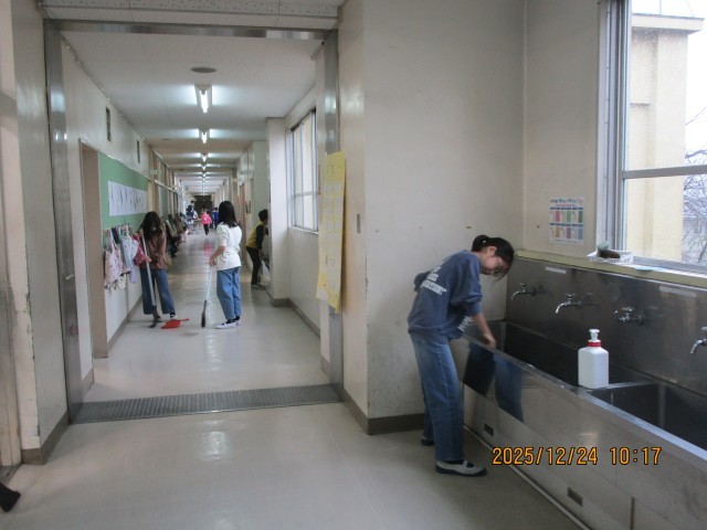 12月24日(水)全校で大掃除を行いました。まずは自分の机や椅子の脚についた埃を拭き取りました。思ったよりたくさん埃がたまっています。教室の床や廊下も水拭きをしたり、黒板をきれいにしたり、いつものお掃除ではできない所も綺麗にしました。何度も雑巾を洗って絞ってまた拭いて、どんどん綺麗になっていきました。同時に心も整っていきますね。みんな一生懸命に自分たちが使った場所を丁寧に掃除することができました。みんなよく頑張りました。新しい年を気持ちよく迎えることができますね。