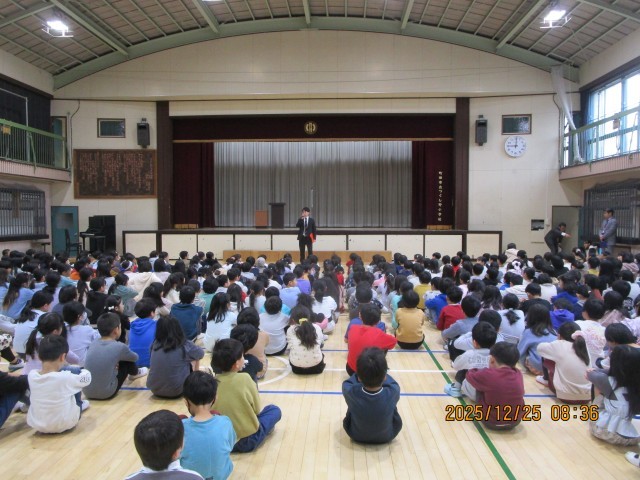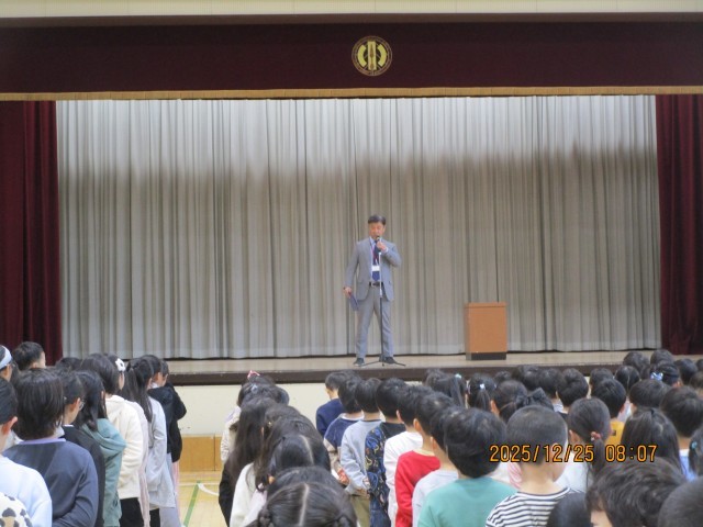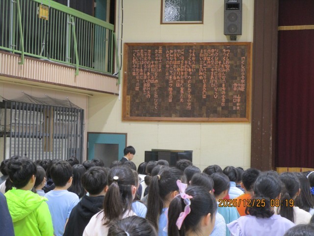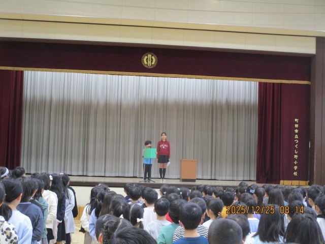 12月25日(木)つくし野小学校2学期終業式が行われました。校長先生からは2学期頑張ったことや冬休みの過ごし方、そして3学期に向けてのお話がありました。そして、1年生と6年生から児童代表のお話もありました。2学期の成長・頑張ったこと、上手くいかなかった時の対処の仕方、3学期に向けて自主的・積極的に取り組む姿勢など素敵なお話でした。校歌も一年の締めくくりにふさわしい澄み渡る元気な声で心があらわれるようでした。生活指導の先生からは、冬休みの過ごし方・お金の使い方・友達との関わり方などのお話がありました。困ったことがあったらお家の人や誰かに相談しましょう。