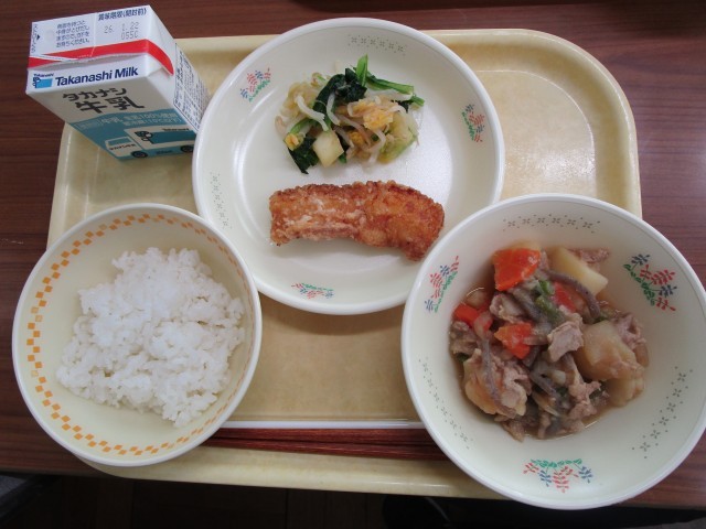 1月20日(火)給食献立 公開日 2026/01/20 更新日 2026/01/20 給食 献立:ご飯・肉じゃが・いかのさらさ揚げ・もやしのお浸し・牛乳 今日は「いか」のお話です。 日本は、世界一「いか」を食べる国だそうです。いかの種類はとても多く、約450種類もの「いか」が世界中の海を泳いでいます。大きさもいろいろで、3㎝ぐらいのから15mもの巨大な「いか」もいるそうです。