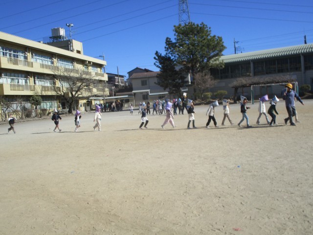 風が強く砂ぼこりが舞う中ではありましたが、子供たちは話をすることなく、先生に続いて校庭へ。