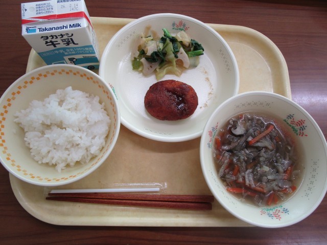 献立:ご飯、沢煮椀、ゼリーフライ、レンコン入りサラダ、牛乳