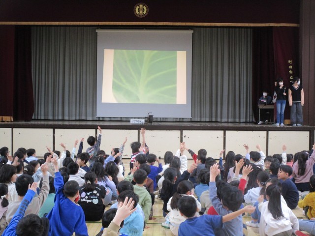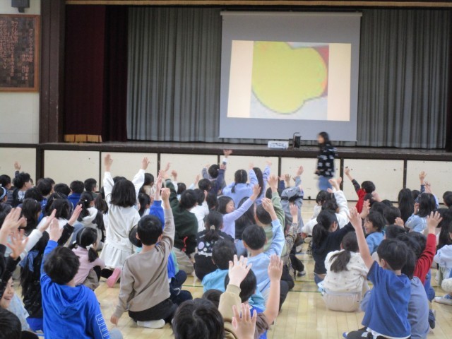 「は~い!」と、元気にたくさんの手が挙がり答えていました。「ドナルド」「キャベツ」「さくらんぼ」「クロームブック」「アンパンマン」・・・体育館が子ども達の熱気で温かくなりました!