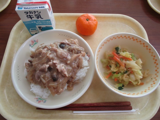 献立:ピリ辛鳥味噌丼、和風サラダ、みかん、牛乳