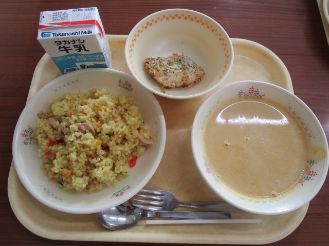 献立:鶏肉のパエリア風、カボチャのポタージュ、魚のパン粉焼き、牛乳