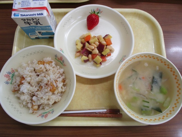 いちごは、もともと5月から6月が旬の果物でしたが、ハウス栽培によって、12月ごろから出回るようになりました。いちごには、体の調子を整えて風を予防するビタミンCがたくさん含まれています。残りの3学期も元気に過ごせるように噛んで食べましょう。