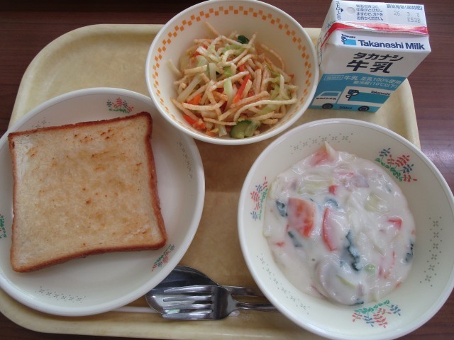 献立:ハニーレモントースト、春キャベツのホワイトシチュー、ポテトのパリパリサラダ、牛乳
