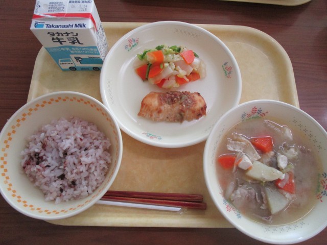 献立:十六穀ご飯、豚汁、いかの香味焼き、梅肉和え、牛乳