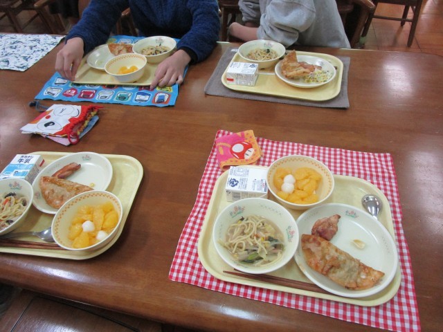 献立:味噌ラーメン、ジャンボ餃子と甘酢あんかけ、コーンとマカロニサラダ、牛乳