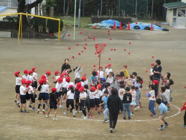 19日(木)には1年生と玉入れを行いました!籠を目指して玉を一生懸命に投げ入れます。勝つと一年生は飛び上がって大喜びです。6年生は利き手でない手で投げるルールを加えながらも本気で挑んでいます。なんと4勝3敗で一年生が勝利しました!
