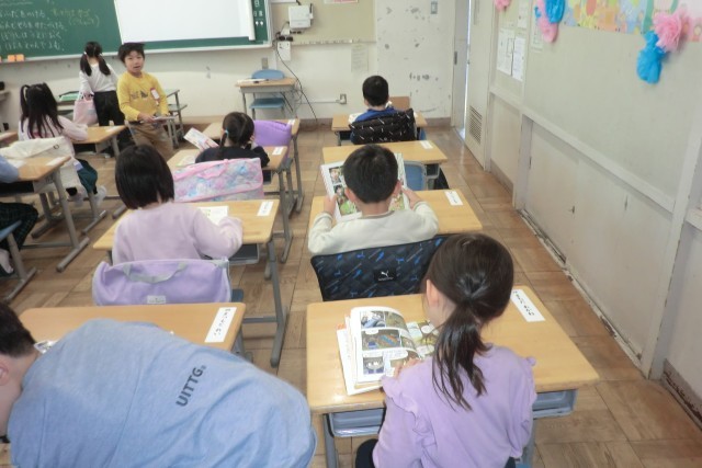 教室では、教科書が配られ、子どもたちが新しい教科書を手にとって見ていました。4年生にどんな教科が好きか尋ねると、理科、図工、体育などと話してくれました。