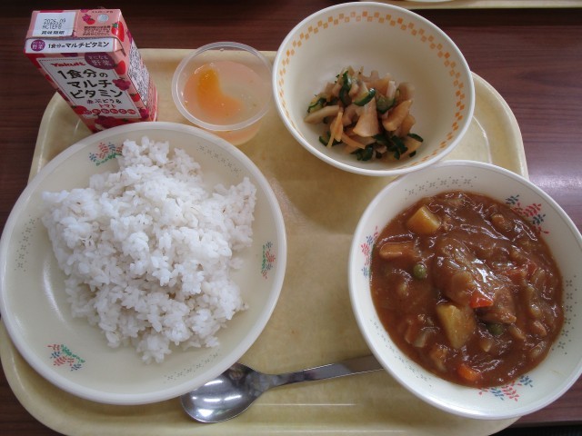 献立:チキンカレーライス、手作り福神漬け、サイダーゼリー、きになる野菜(赤ぶどう&トマト)